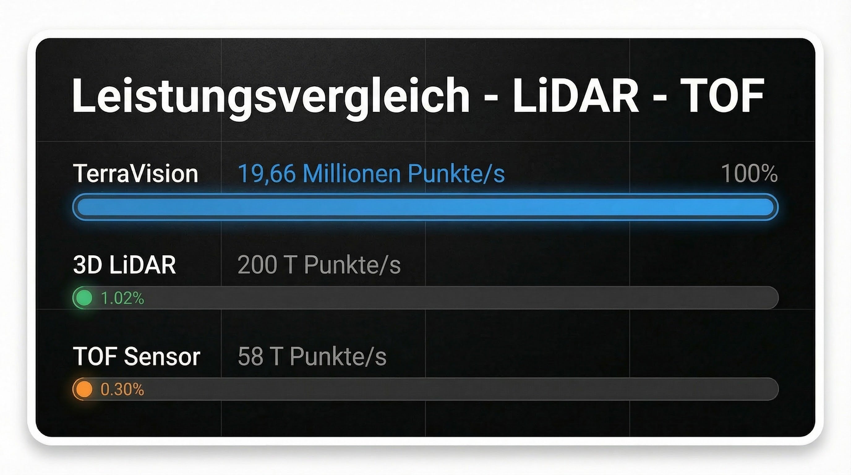 Die Technologie Antwort: Der Terramow (entwickelt von Muxin Intelligence) geht einen völlig anderen Ansatz. Er ist zu 100 % kamerabasiert (3D KI-Vision). Das TerraVision™ 2.0 KI-Dreifach-Kamerasystem verarbeitet unfassbare 19.660.800 Datenpunkte pro Sekunde. Das ist die 98-fache Informationsdichte gegenüber einem LiDAR System.