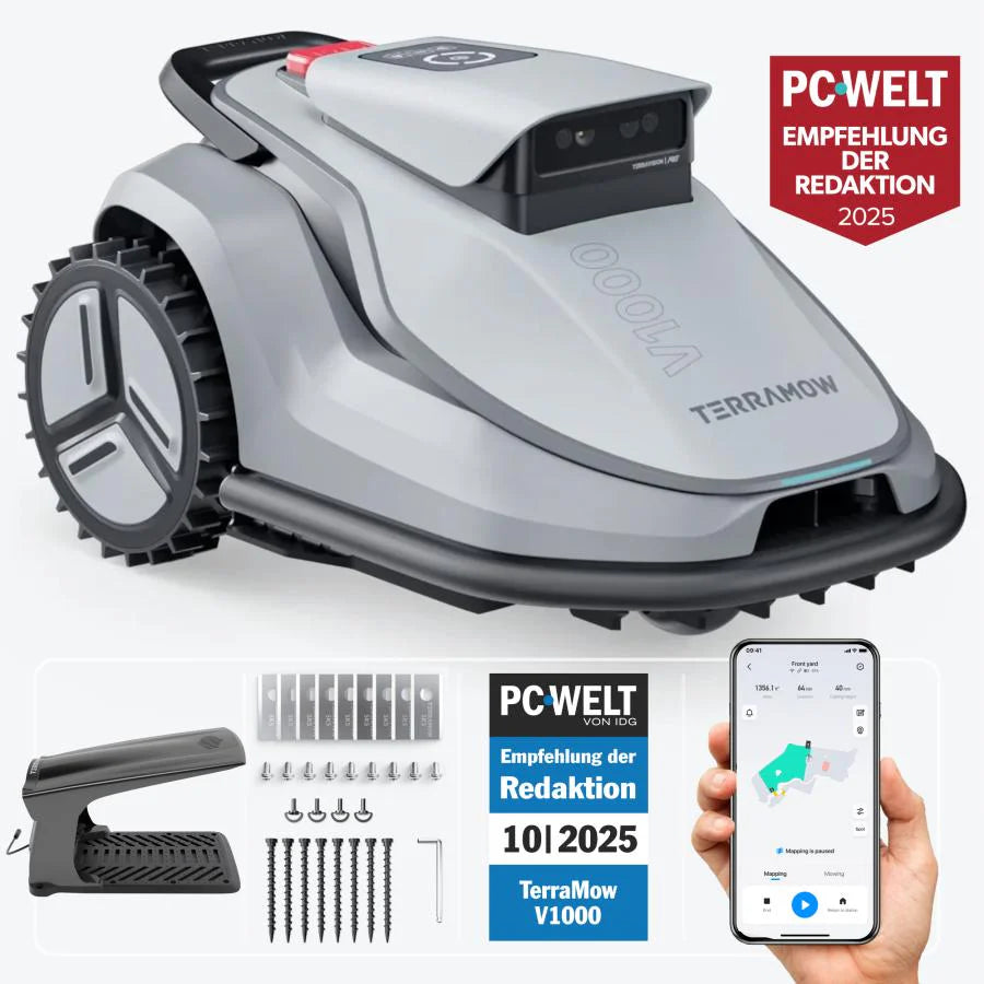 Der TerraMow V1000 ist der erste Mähroboter seiner Klasse, der ohne Begrenzungskabel, ohne RTK-Antenne und sogar ohne App-Zwang einsatzbereit ist. Ideal für alle, die den technischen Aufwand vermeiden wollen.